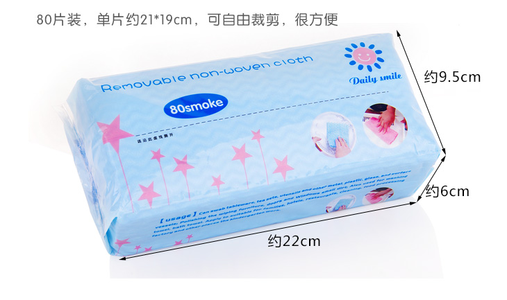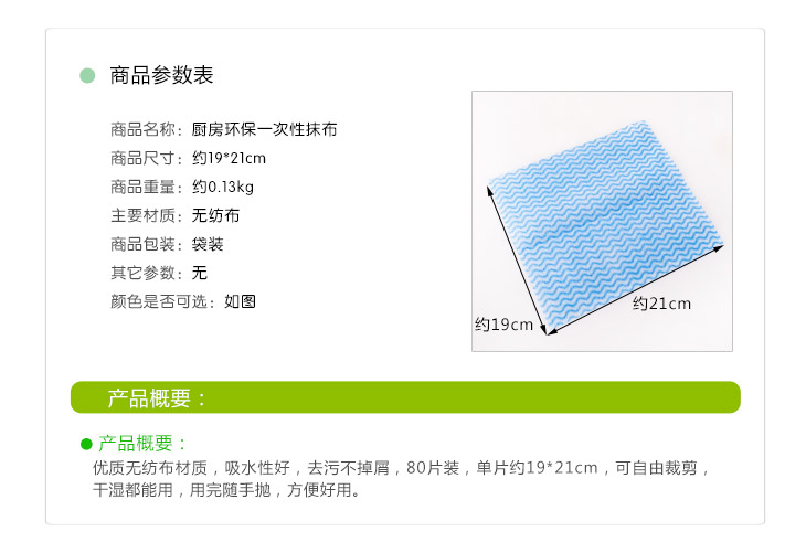 产品名称:环保一次性无纺布抹布 产品颜色:蓝色,白色,红色,绿色,产品规格:20*20CM,一包里面装80片,产品克重:0.11KG